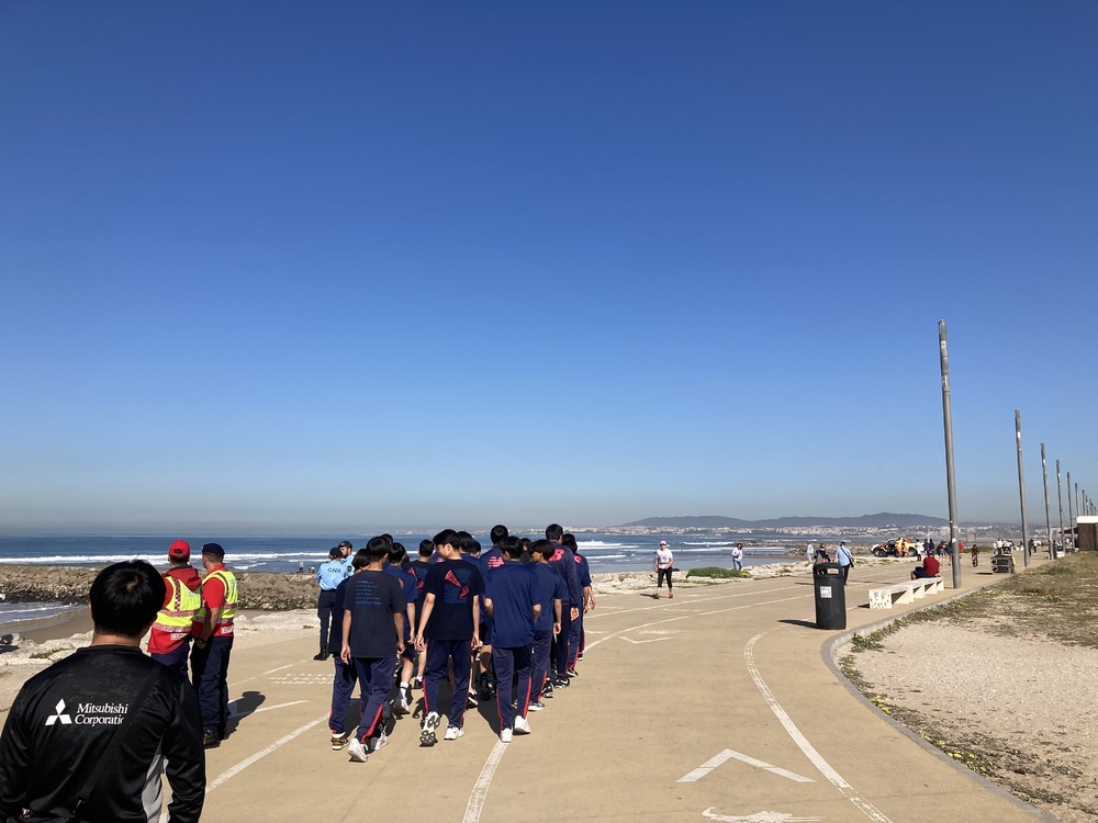 아침 식사를 한 후 잠시 휴식을 취한 뒤, 오전에는 18:30 킥오프 경기에 대비해 해안가를 약 1시간 정도 산책했습니다. 이번 숙박지 인근 바다는 서핑으로 유명한 장소이며, 전 세계 바다를 무대로 열리는 월드 서핑 리그 대회가 개최되고 있어 산책 중에 관람할 수 있었습니다.