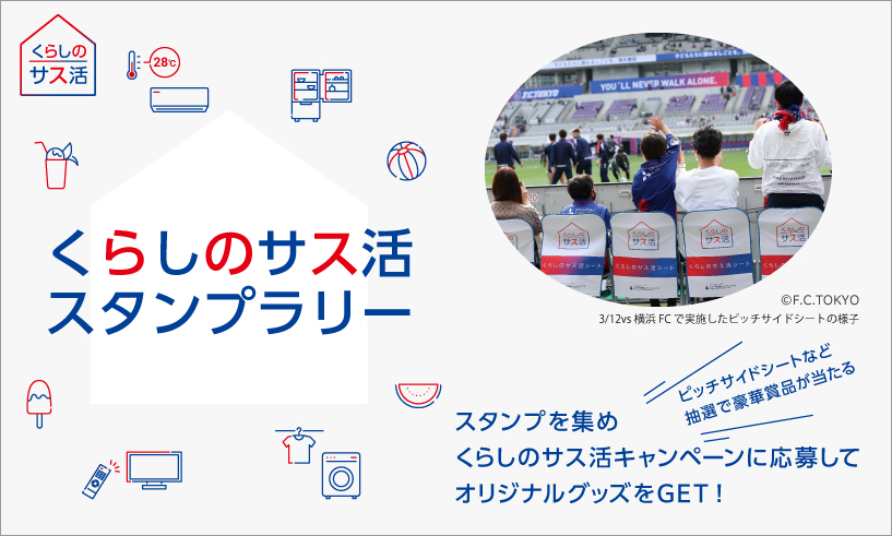 쿠라시노 사스카츠 부스에서 배포하는 스탬프 랠리 대지를 받아, 각 부스나 행사장 내에서 지속 가능한 활동에 참여하여 받을 수 있는 스탬프를 모으고, FC 도쿄 피치 사이드 시트 등 호화 상품이 걸린 「쿠라시노 사스카츠 캠페인」에 응모합시다! 응모해 주신 분께는 참가상으로 대지와 교환하여 오리지널 상품을 선물로 드립니다!