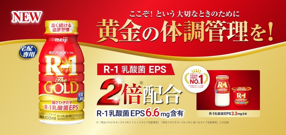 「메이지 프로비오 요거트」의 신상품인 「메이지 프로비오 요거트 R-1 드링크 타입 The GOLD」가 6월 1일(목)에 배달 전용 상품으로 새롭게 출시되었습니다.