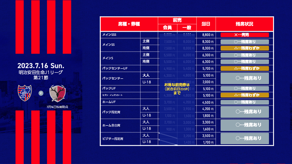 ※경기 당일 현장에서 당일권 판매는 하지 않습니다. 티켓은 FC 도쿄(J리그 티켓)에서만 판매합니다.