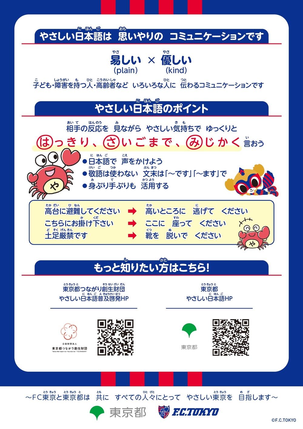 FC 도쿄에서는, 2023년 9월 23일(토·공휴일) 2023 메이지 야스다 생명 J1리그 제28라운드 vs 사간 도스전(15:00 킥오프/아지노모토 스타디움)에서 도쿄도와 연계하여 ‘쉬운 일본어’ 보급 계몽 PR을 실시합니다.