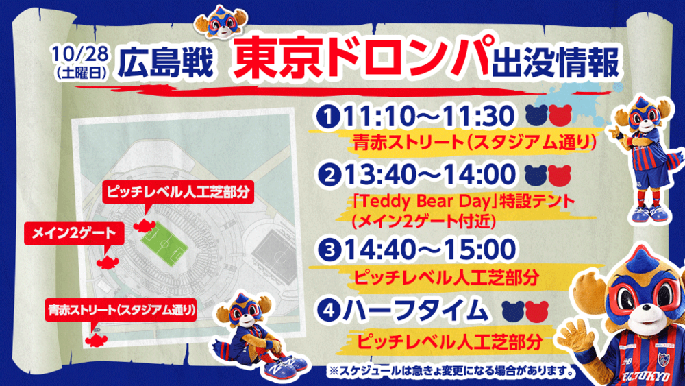 10월 28일(토) 2023 메이지 야스다 생명 J1리그 제31라운드 vs 산프레체 히로시마 (15:00 킥오프/아지노모토 스타디움)에 도쿄 도롱파가 아래와 같이 나타납니다.