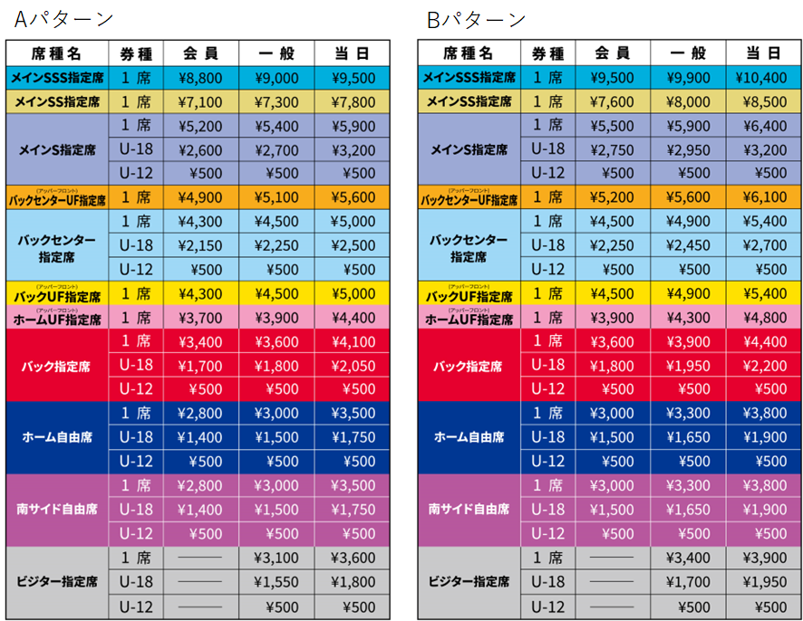 ※티켓 판매 방법 및 가격대는 경기 시기나 상대 팀 등에 따라 변경될 수 있습니다. 각 패턴의 개최 경기 수는 각각 절반 정도를 예정하고 있습니다. 2024 시즌에도 국립경기장에서의 경기를 계획하고 있으나, 현 시점에서는 미정입니다. 개최 시에는 좌석 배치 및 판매 가격이 위 가격대와 다릅니다
