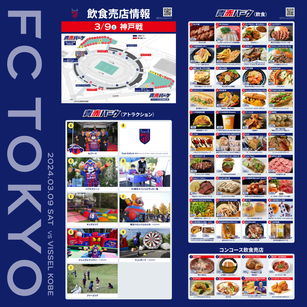 3월 9일(토) 고베전의 아오아카 파크(장외), 출장!! 아오아카 파크, 스타디움 내 콩코스(장내) 매점에서 판매하는 음식 및 음료 정보를 알려드립니다.