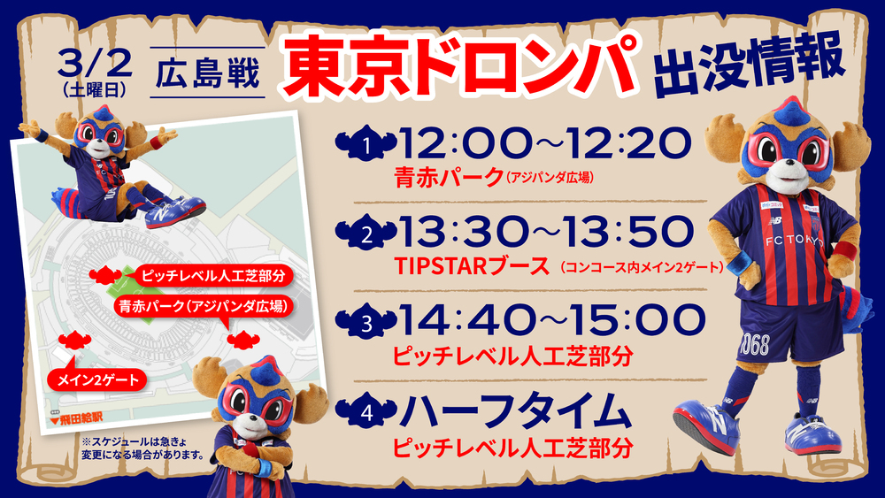 3월 2일(토) 2024 메이지 야스다 J1리그 제2절 vs 산프레체 히로시마 (15:00 킥오프/아지노모토 스타디움)에 도쿄 도롱파가 아래와 같이 나타납니다. 꼭 기대해 주세요!