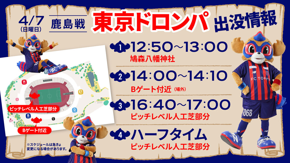 4월 7일(일) 2024 메이지 야스다 J1리그 제7절 vs 가시마 앤틀러스 (17:00 킥오프/국립경기장)에 도쿄 도롱파가 아래와 같이 나타납니다.
