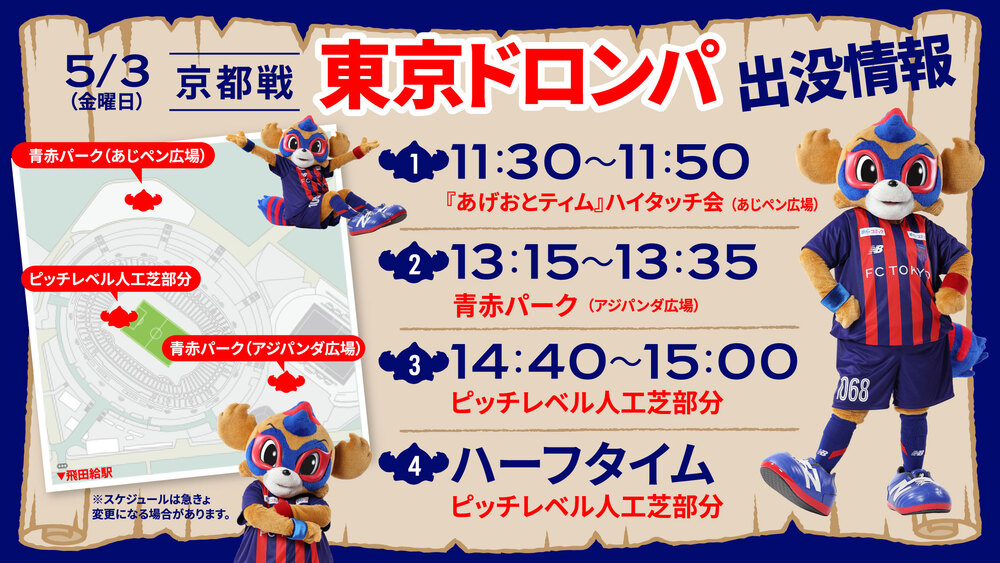 5월 3일(금, 공휴일) 2024 메이지 야스다 J1리그 제11절 vs 교토 산가 FC(15:00 킥오프/아지노모토 스타디움)에 도쿄 도롱파가 아래와 같이 나타납니다.