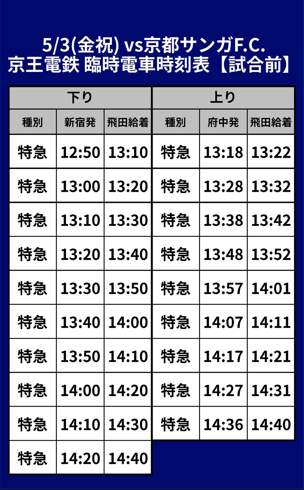 5월 3일(금공휴일) 2024 메이지 야스다 J1리그 제11절 vs 교토 산가 FC(15:00 킥오프/아지노모토 스타디움)에서 운행되는 임시 교통 접근(철도), 셔틀버스·노선버스에 대해 안내드립니다.