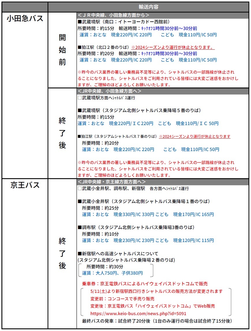 5월 19일(일) 2024 메이지 야스다 J1리그 제15절 vs 요코하마 F.마리노스(15:00 킥오프/아지노모토 스타디움)에서 운행되는 임시 교통 접근(철도), 셔틀버스·노선버스에 대해 안내드립니다.