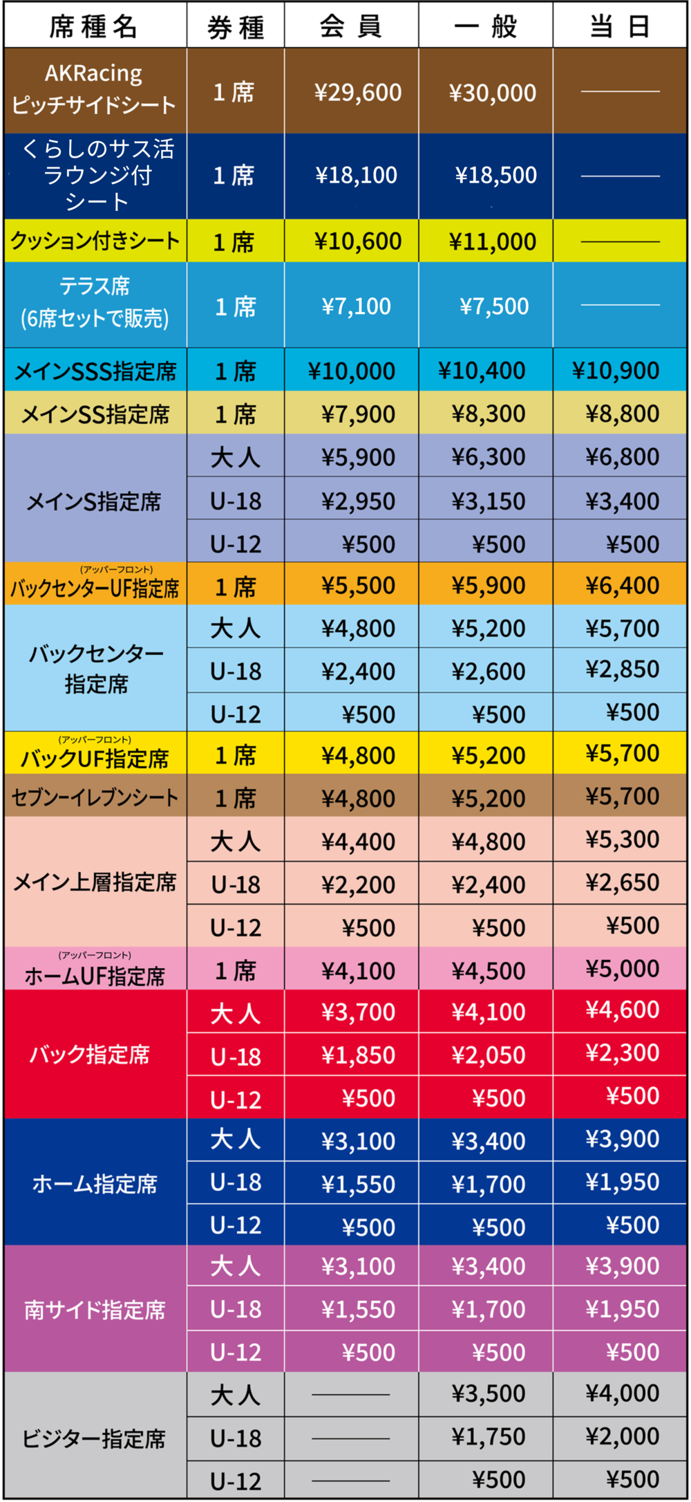 ※U-18 요금은 2006년 4월 2일 이후 출생자, U-12 요금은 2012년 4월 2일 이후 출생자가 대상입니다. 미취학 아동은 보호자의 무릎 위에서 관전하는 경우에 한해 티켓이 필요하지 않습니다