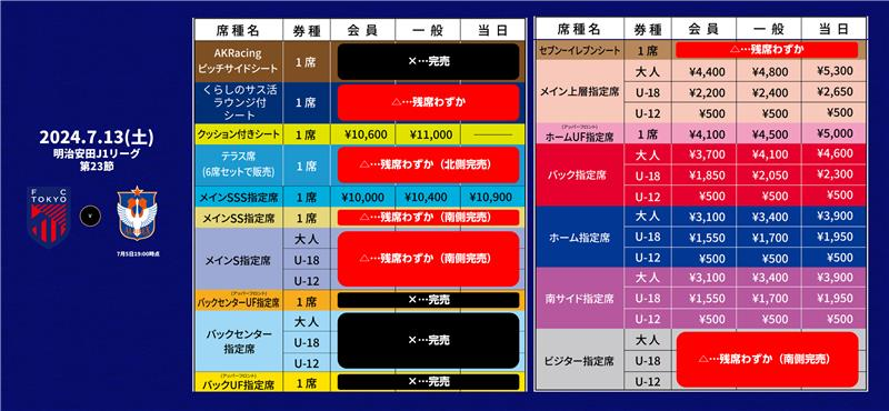 ※현재 티켓 FC 도쿄 판매 표시가 "〇"로 되어 있어도, 연석 재고가 거의 남지 않은 좌석 종류가 많아지고 있으니, 방문을 고려 중이신 경우 빠른 티켓 구매를 권장드립니다.