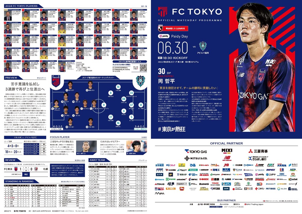 6월 30일(일) 2024 메이지야스다 J1리그 제21절 vs 아비스파 후쿠오카(18:30 킥오프/아지노모토 스타디움) 공식 매치데이 프로그램에 대해 아래와 같이 안내드립니다.