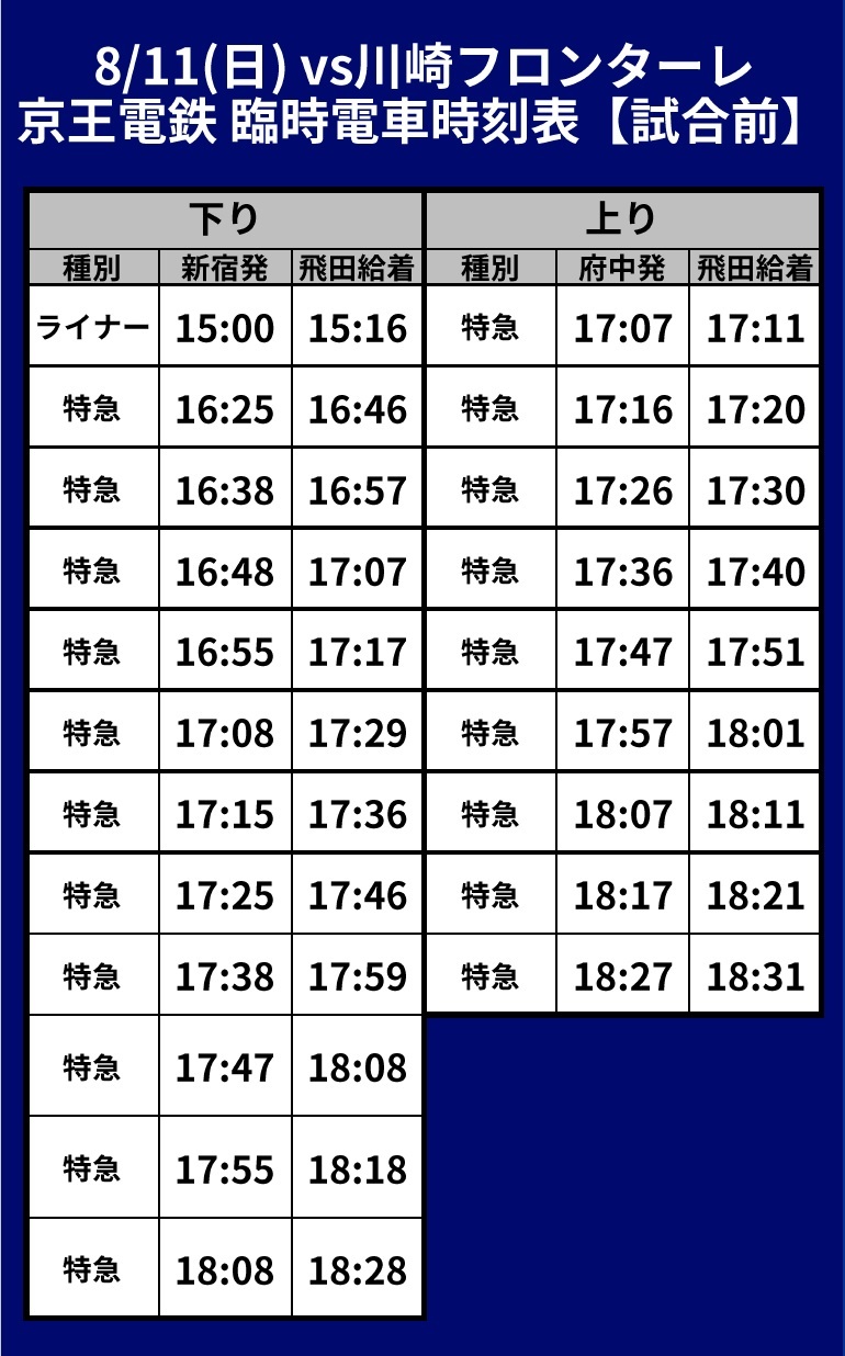 8월 11일(일) 2024 메이지야스다 J1리그 제26절 vs 가와사키 프론탈레(19:00 킥오프/아지노모토 스타디움)에서 운행되는 임시 교통 접근(철도), 셔틀버스·노선버스에 대해 안내드립니다.