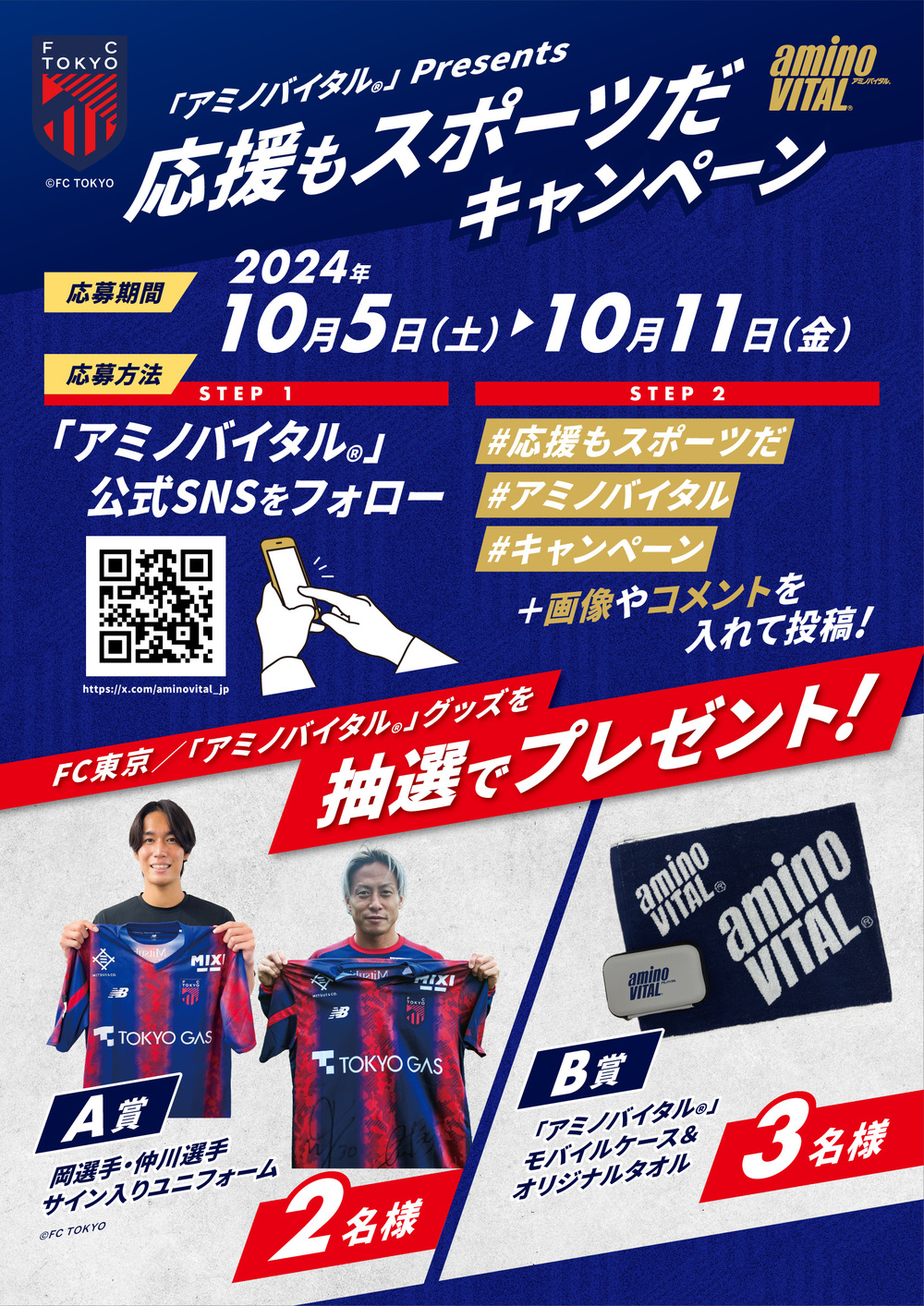 「응원도 스포츠다!」캠페인으로서, 「#응원도스포츠다」「#아미노바이탈」「#캠페인」을 붙여 게시하면, 선수 사인 유니폼이나 아미노바이탈® 굿즈가 당첨되는 캠페인을 실시합니다.