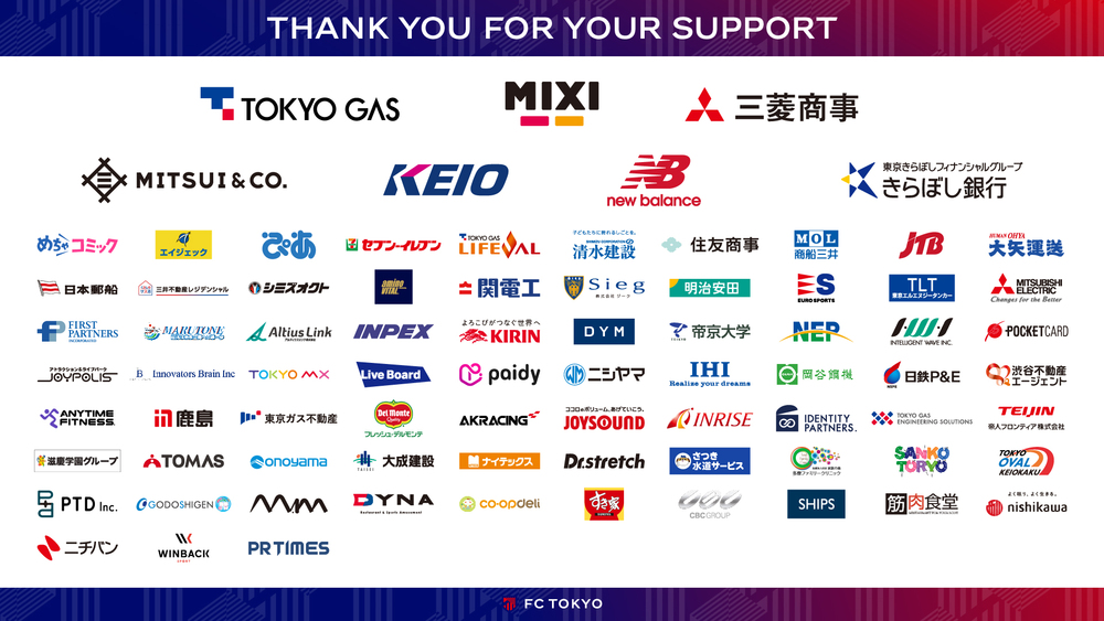 2025 시즌 「오피셜 파트너」 결정 안내 2025/2/1 클럽 소식 2025 시즌 오피셜 파트너가 결정되어 알려드립니다. FC 도쿄의 뜻에 공감해 주신 총 80개사의 오피셜 파트너 여러분과 함께 싸워 나가겠습니다. ※오피셜 파트너 기업은 2월 1일 기준입니다 □오피셜 파트너 기업