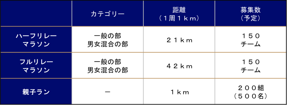 1주 1km 코스를 친구나 부부, 회사 동료와 함께 참가할 수 있는 "릴레이 마라톤(풀/하프)" 외에도, 초등학생 이하나 미취학 아동도 보호자와 함께 즐길 수 있는 "부자(모자) 달리기" 등 다양한 즐길 거리가 있는 이벤트입니다.