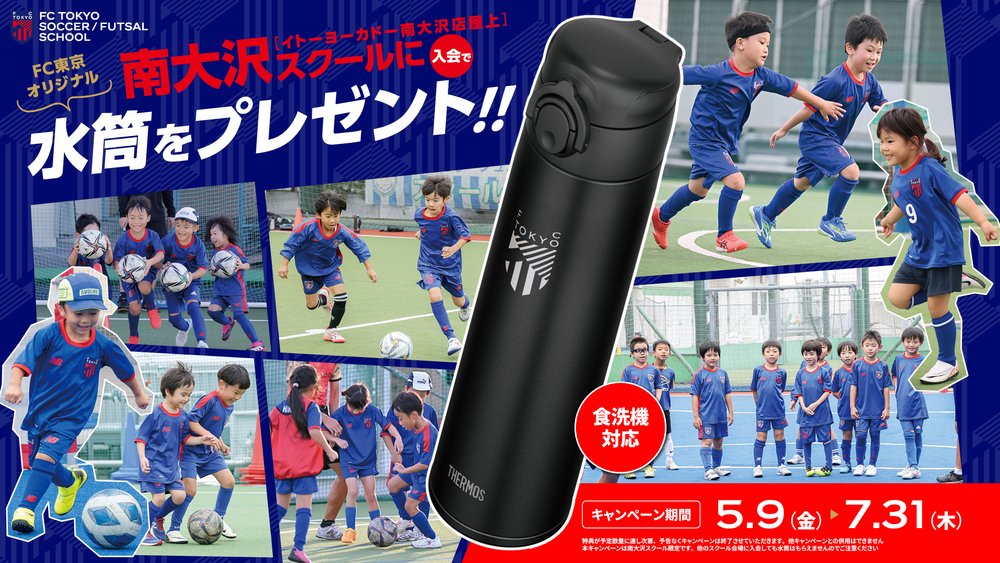 FC 도쿄 축구·풋살 스쿨에서는 5월 9일(금)부터 7월 31일(목)까지 「미나미오사와 스쿨 한정! 오리지널 디자인 물통 증정 입회 캠페인」을 실시합니다.
