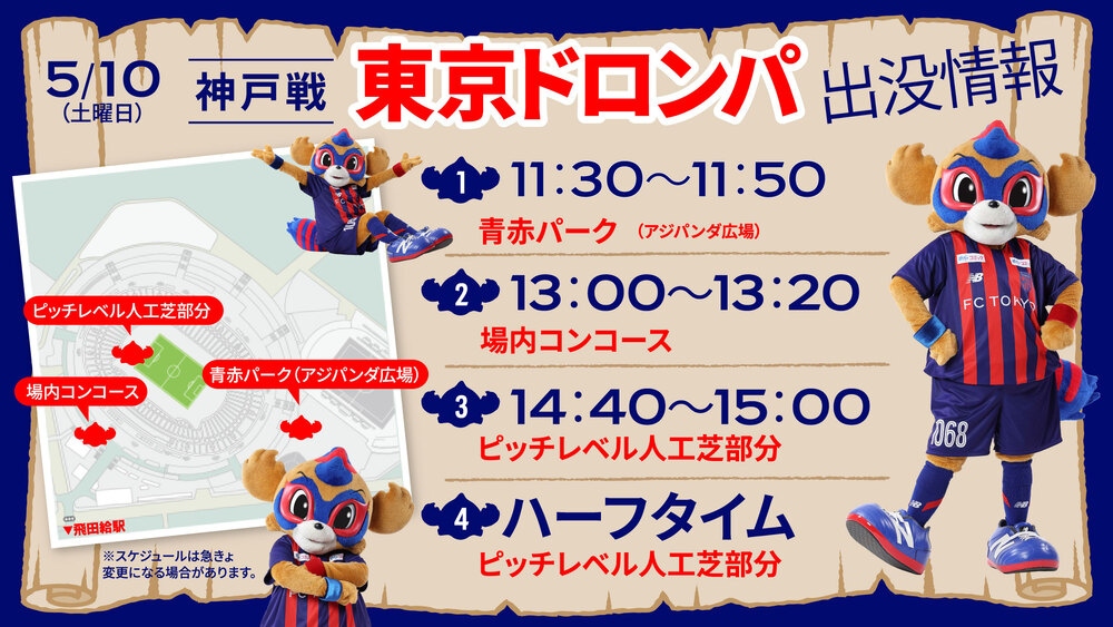5월 10일(토) 2025 메이지야스다 J1리그 제16절 vs 비셀 고베 (15:00 킥오프/아지노모토 스타디움)에 도쿄 도롱파가 아래와 같이 나타납니다.