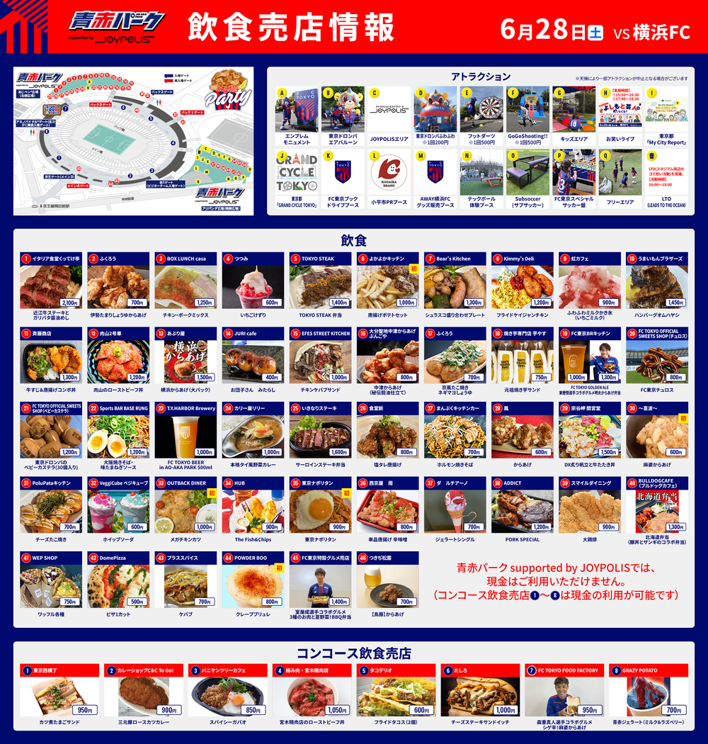 6월 28일(토) 2025 메이지야스다 J1리그 제22절 vs 요코하마 FC(19:00 킥오프/아지노모토 스타디움)의 아오아카 파크 supported by JOYPOLIS (외부), 출장!! 아오아카 파크 supported by JOYPOLIS, 스타디움 내 콘코스(내부) 매장에서 판매하는 음식 및 음료 정보를 알려드립니다.