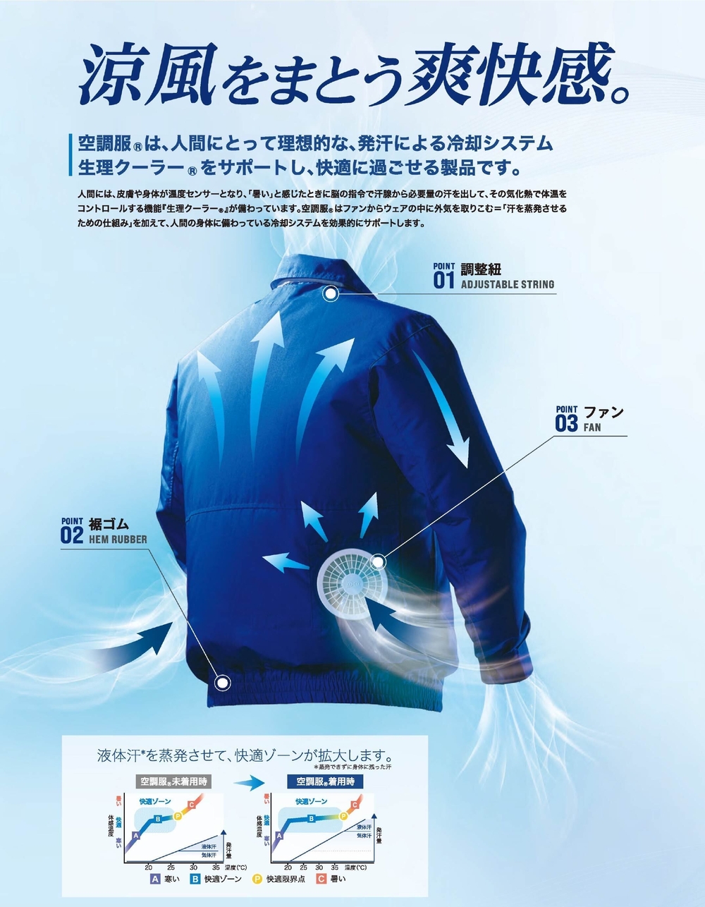 스타디움 관전 등 피할 수 없는 여름 더위에 맞서기 위해 등 부분에 팬을 장착할 수 있는 조끼형 공기조절복입니다.