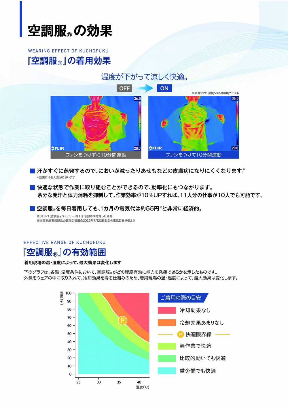 등에 있는 팬에서 보내는 바람으로 땀을 증발시켜 몸을 식혀 쾌적한 상태를 유지합니다.