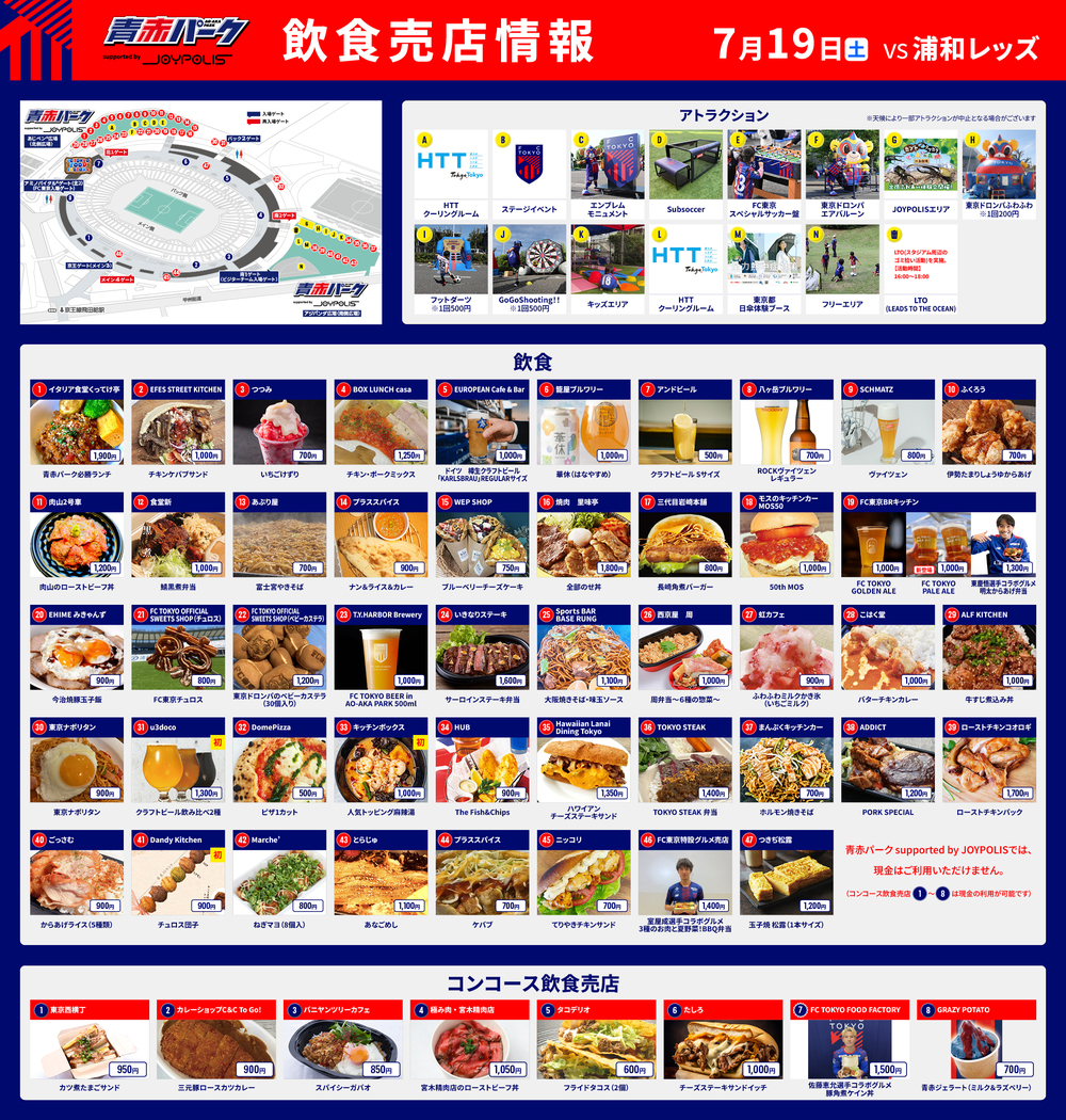 7월 19일(토) 2025 메이지 야스다 J1리그 제24절 vs 우라와 레즈(19:00 킥오프/아지노모토 스타디움)의, 아오아카 파크 supported by JOYPOLIS (장외), 출장!! 아오아카 파크 supported by JOYPOLIS, 스타디움 내 콘코스(장내) 매점에서 판매하는 음식 및 음료 정보를 알려드립니다.