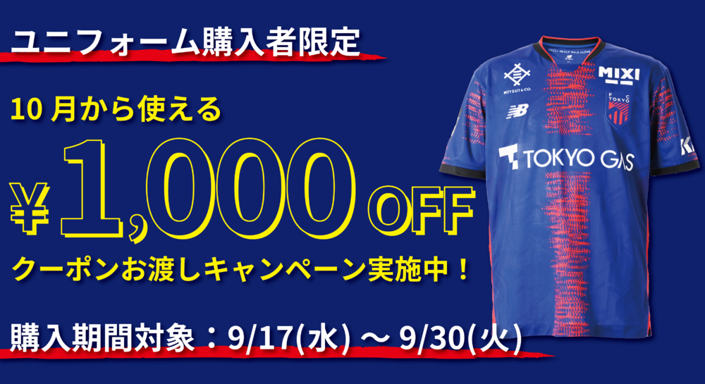 2025년 9월 17일(수) 17:00부터 9월 30일(화) 23:59까지 기간 중에 오피셜 온라인샵에서 시즌 유니폼을 구매하신 고객님께 10월 이후에 사용할 수 있는 1,000엔 할인 쿠폰을 증정합니다!