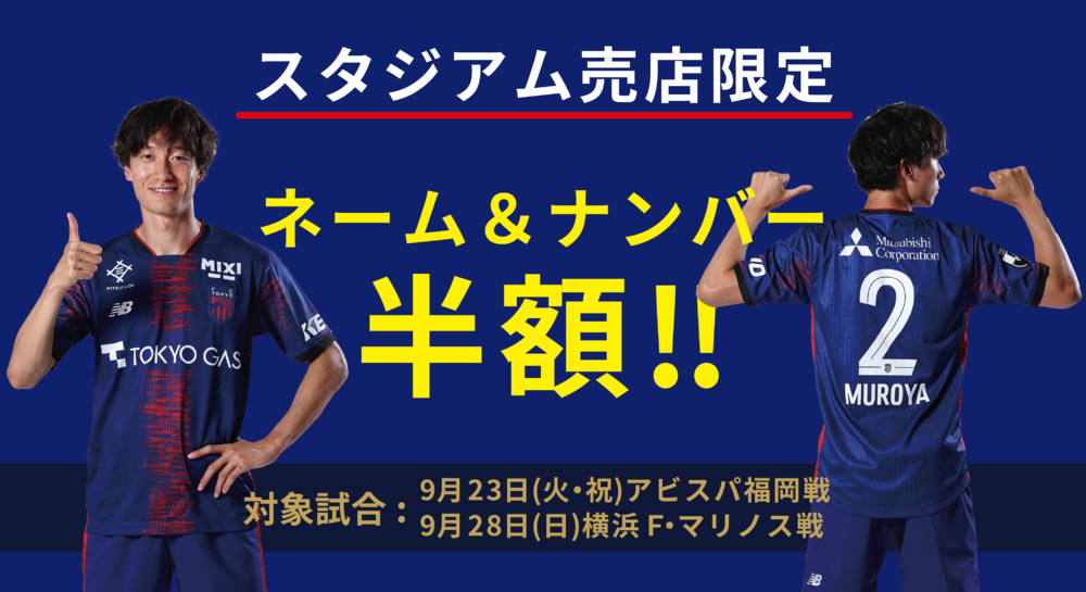 9월 23일(화휴) 아비스파 후쿠오카전·9월 28일(일) 요코하마 F.마리노스전 한정으로 스타디움 매장에서 네임&넘버가 붙은 유니폼을 구매하거나 압착 가공 유니폼을 주문하신 분께 네임&넘버 비용을 반값인 2,200엔(세금 포함)으로 제공해 드립니다!