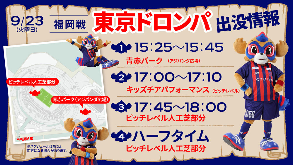 9월 23일(화공휴일) 2025 메이지 야스다 J1리그 제31라운드 vs 아비스파 후쿠오카(18:00 킥오프/아지노모토 스타디움)에 도쿄 도롱파가 아래와 같이 출현합니다. 기대해 주세요!