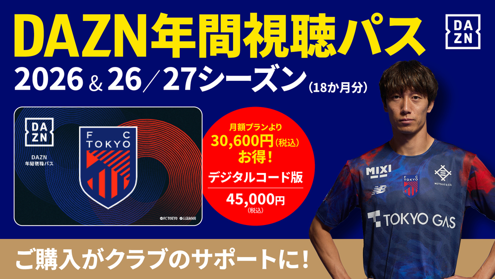 FC 도쿄에서는 2025년 10월 1일(수) 10:00부터 『DAZN 연간 시청 패스 2026 & 2026/27 시즌 (18개월분)』의 수량 한정 판매를 시작합니다.