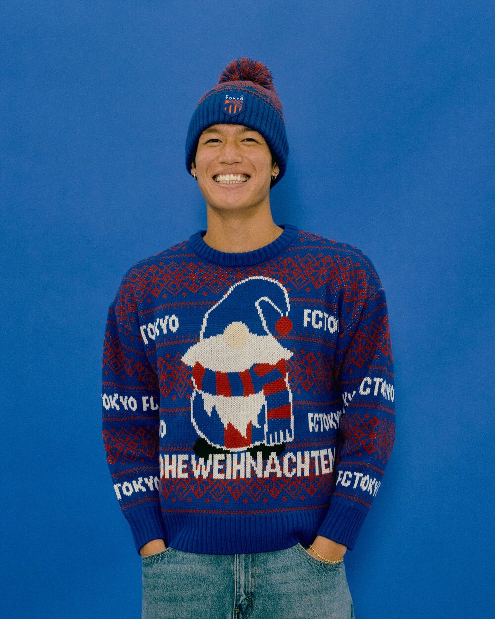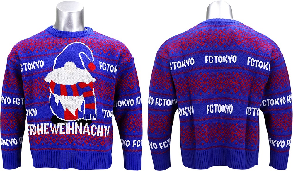 중앙에 청적색 산타와 독일어로 FROHE WEIHNACHTEN (메리 크리스마스)라고 크게 넣은 FC 도쿄 오리지널 어글리 스웨터는 멋있어질지 촌스러워질지는 코디 방법에 달려있습니다!?