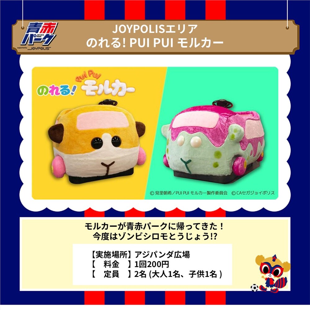 아오아카 파크(아지판다 광장(남쪽 광장)) 내의 'JOYPOLIS 에리어'에서 'OH!RING', '탈 수 있는! PUI PUI 몰카', 'PUI PUI 몰카 함께 드라이브♪' 콘텐츠를 실시합니다. OH!RING은 도쿄 조이폴리스에서 대인기인 카니발 게임입니다. 색이 칠해진 구멍에 공이 멈추면 경품 획득! 어린 아이도 쉽게 즐길 수 있습니다.