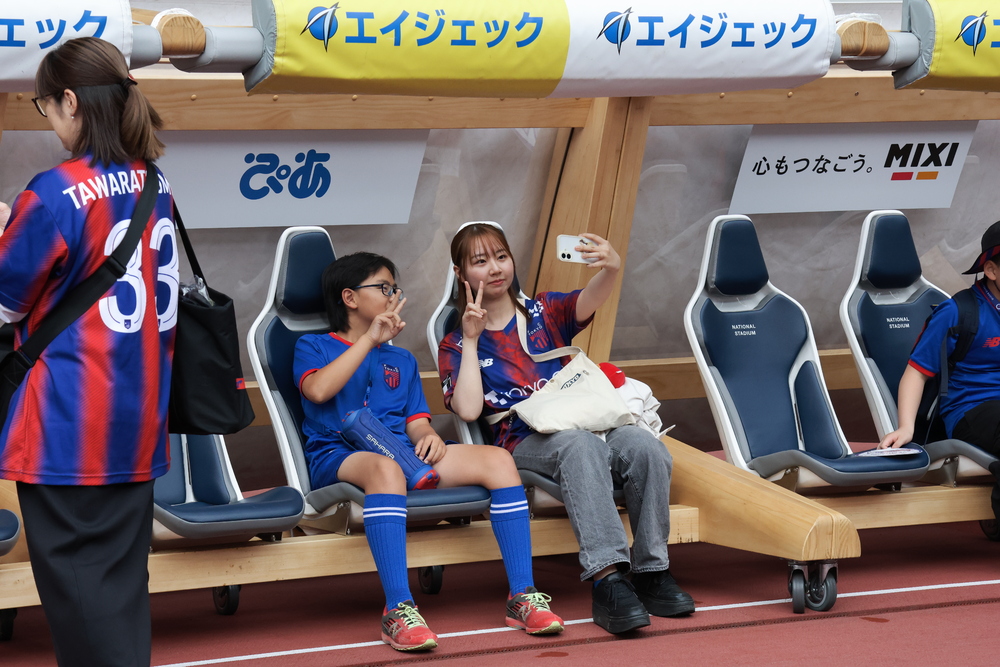 피치에 나가 선수들이 사용하는 벤치를 체험하고, 눈앞의 아름다운 잔디와 피치에서 올려다보는 평소와는 다른 국립경기장의 풍경에 흥분한 모습이었습니다!