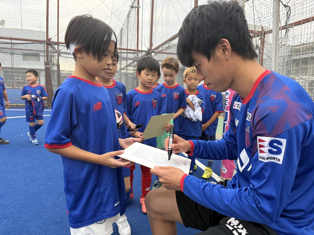 킨더 클래스부터 초등학교 6학년까지의 스쿨생들이 모여, 동경하는 톱팀 선수를 앞에 두고 눈을 반짝이고 있었습니다.