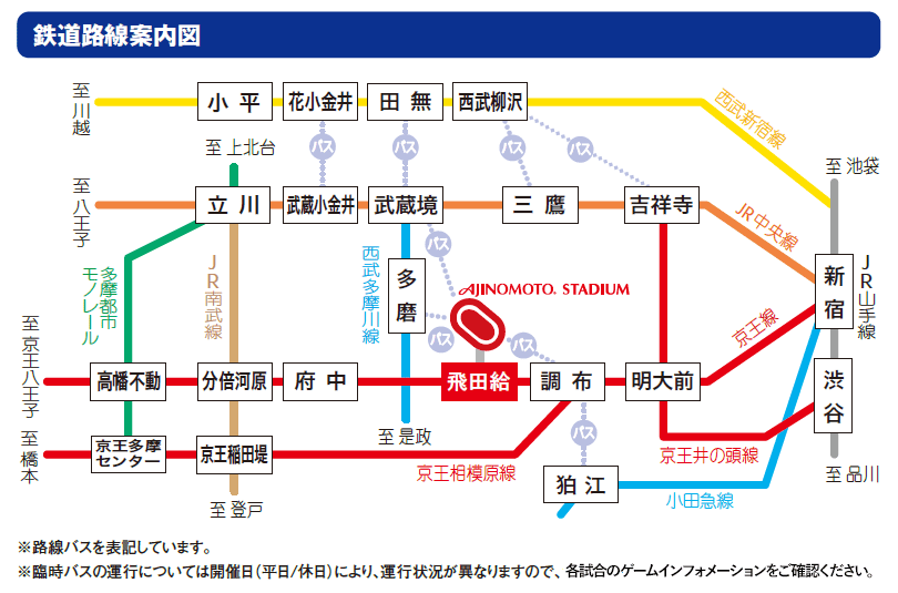 스타디움 앞 페데스트리언 데크~육교는 도비타큐 역으로 향하는 보행자로 혼잡하므로, 경기 종료부터 보행자가 줄어들 때까지(약 2시간)는 육교 내에 자전거를 들여놓을 수 없습니다. 미리 양해 부탁드립니다.