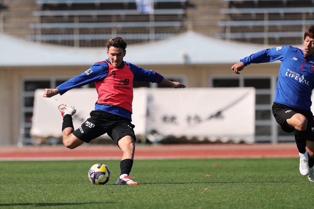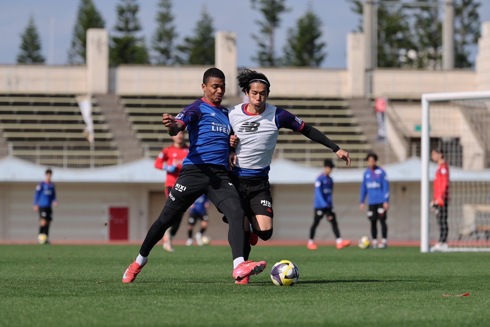 Naquele dia, estava prestes a começar o menu tático. O treinador Rikizo MATSUHASHI perguntou: "Quantos gols o Teruhito NAKAGAWA vai marcar nesses poucos minutos de treino?" e "Quantas vezes o Takahiro KO vai recuperar a bola?", fazendo cada jogador estabelecer metas específicas. Graças à estratégia desse comandante, diferente do dia anterior, quando os erros se sucederam, ao calcular a partir das metas, surgiu uma atitude proativa que também levou a uma boa cooperação.