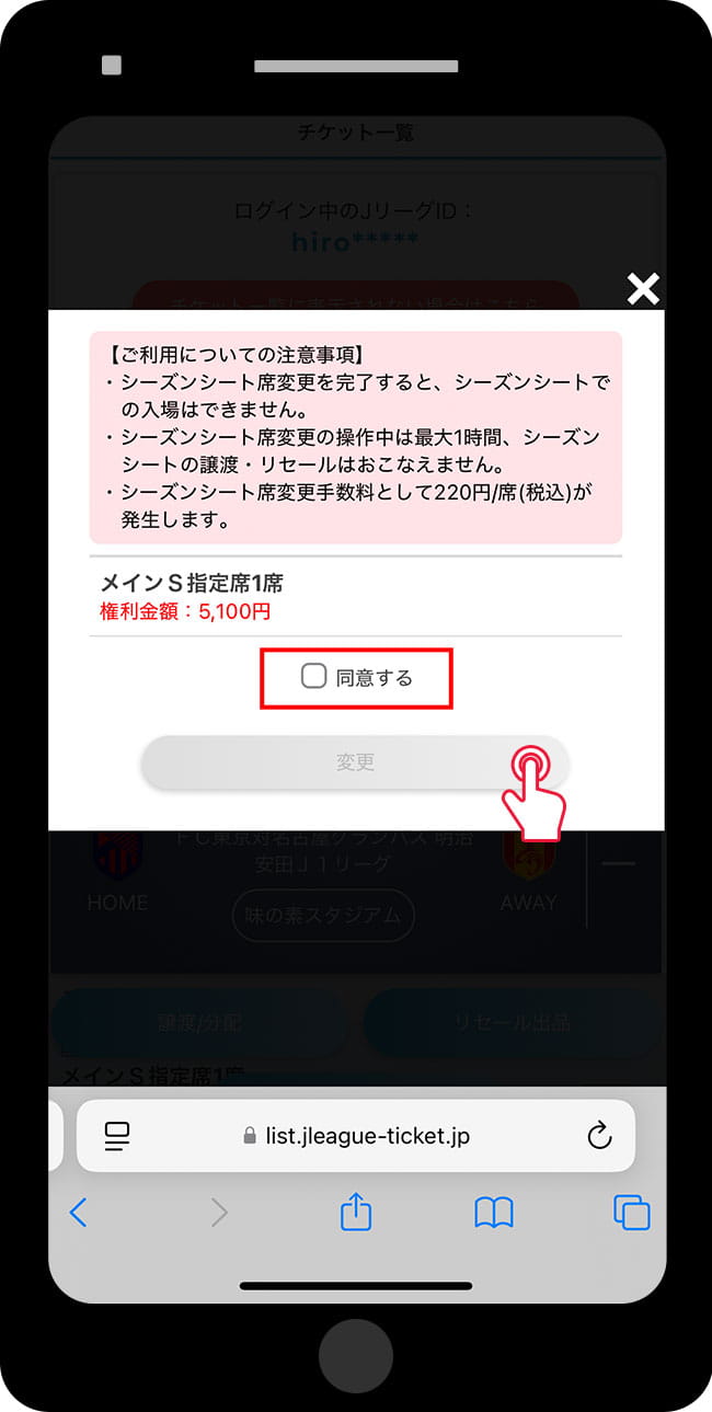 ※ Será exibido "Alteração de assentos do passe da temporada em andamento" na parte superior.