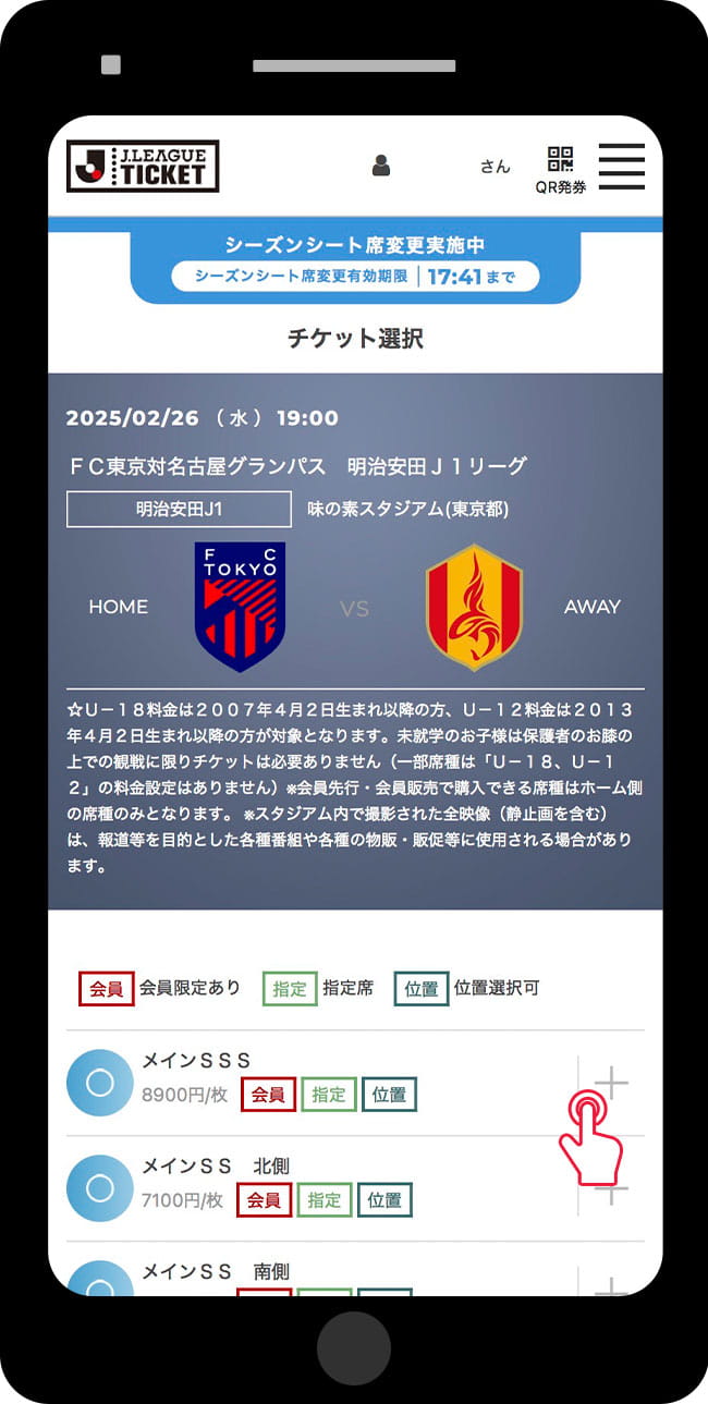 ※ Nos jogos em casa realizados no Japan National Stadium, os sócios com assentos livres em casa deverão realizar a "aquisição de assento por 0 ienes", mas após a aquisição por 0 ienes, não será possível utilizar o serviço de troca de assentos.