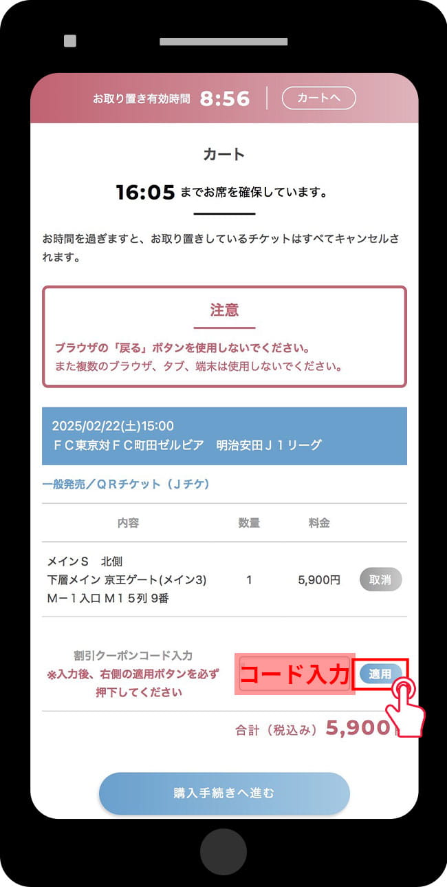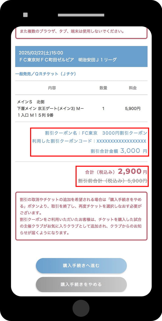 Ao usar o código do cupom de desconto listado na Minha Página ao comprar ingressos para assistir no Ticket FC Tokyo, o valor correspondente será descontado (ou você será convidado).