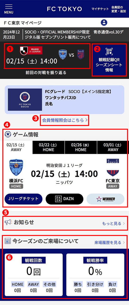 Os sócios podem verificar as informações do assento da temporada e o número do assento.