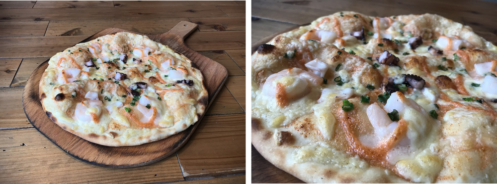 Pizza de frutos do mar que combina perfeitamente com molho de maionese de tarako! Coma a pizza de hat-trick de 3 tipos de frutos do mar (camarão, lula, polvo) enquanto assiste ao futebol!