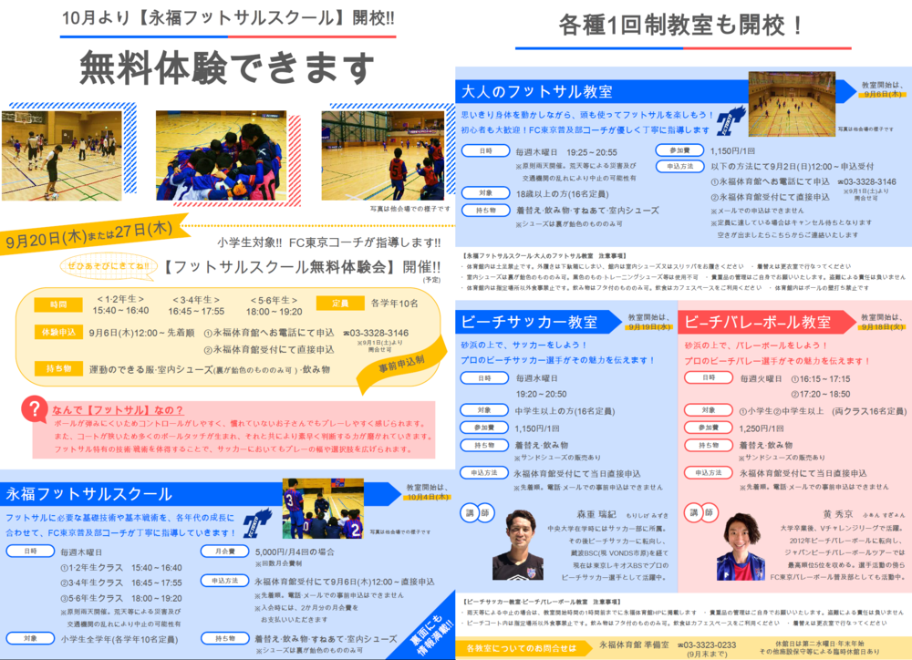 O FC Tokyo é responsável pelo ensino em uma escola de futsal destinada desde alunos do ensino fundamental até adultos, além disso, também se dedica à gestão de aulas de vôlei de praia e futebol de praia utilizando quadras de areia.
