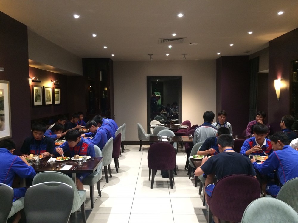 No dia anterior ao torneio, realizamos uma reunião tática no hotel para aumentar a compreensão tática de toda a equipe. Após a reunião, treinamos no campo do Fulham FC.