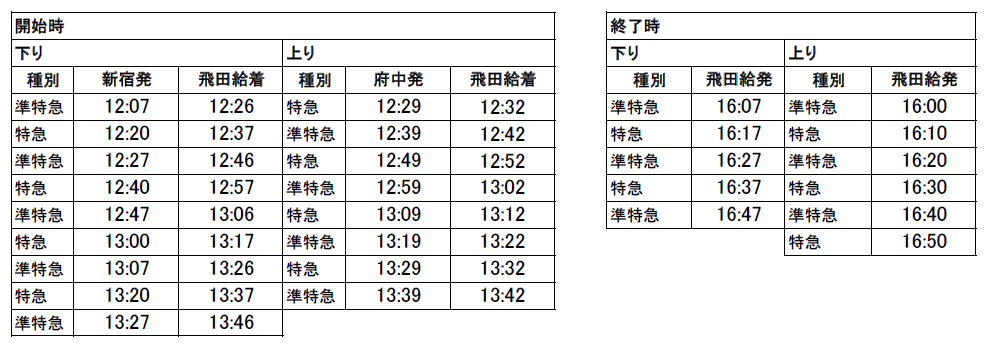 Sentido descida… 9 trens expressos e semi-expressos das 12:07 às 13:27 partindo de Shinjuku