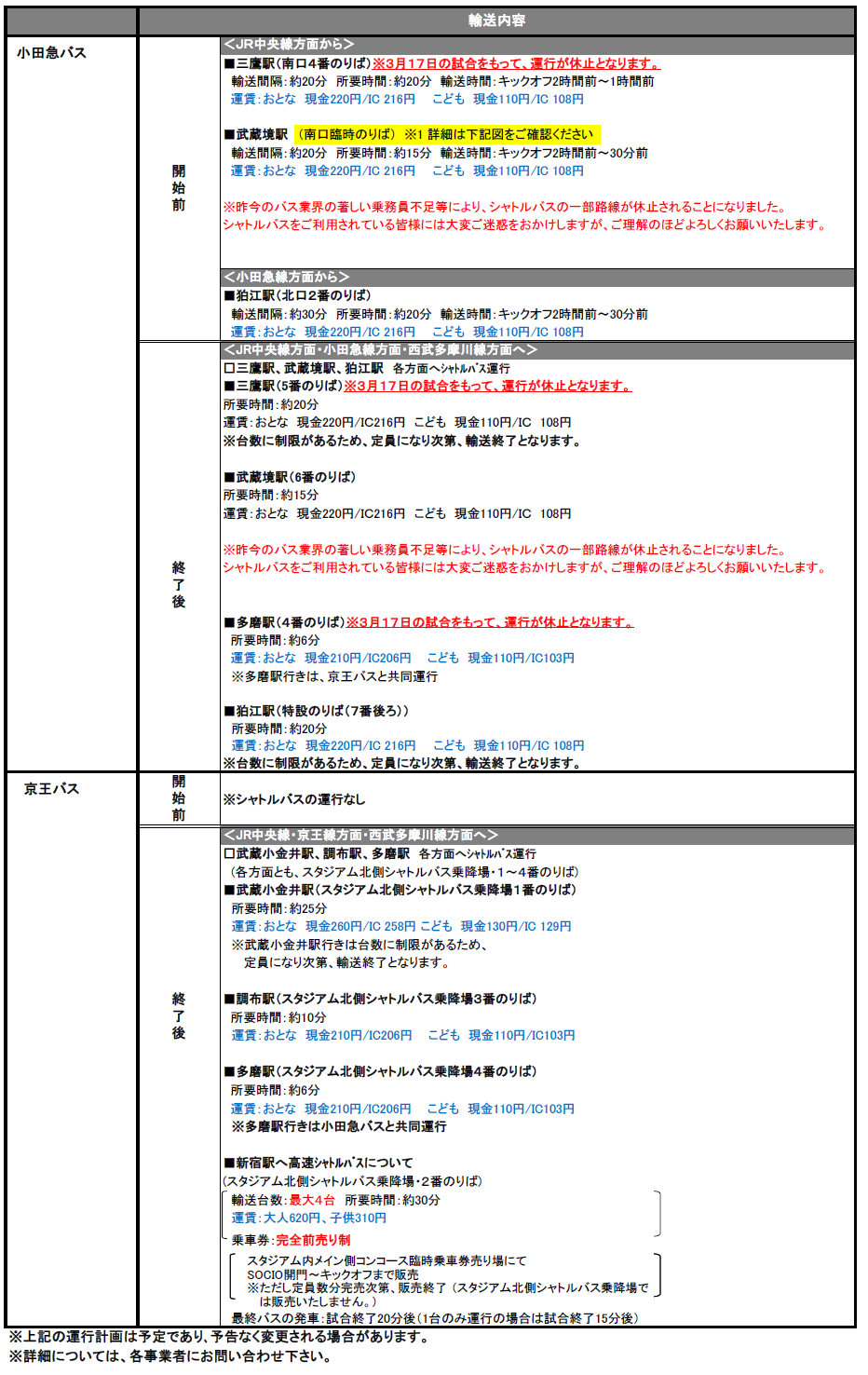 ※Os ônibus Odakyu e a estação Kichijoji suspenderam as operações em 10/3, tanto antes quanto depois das partidas.