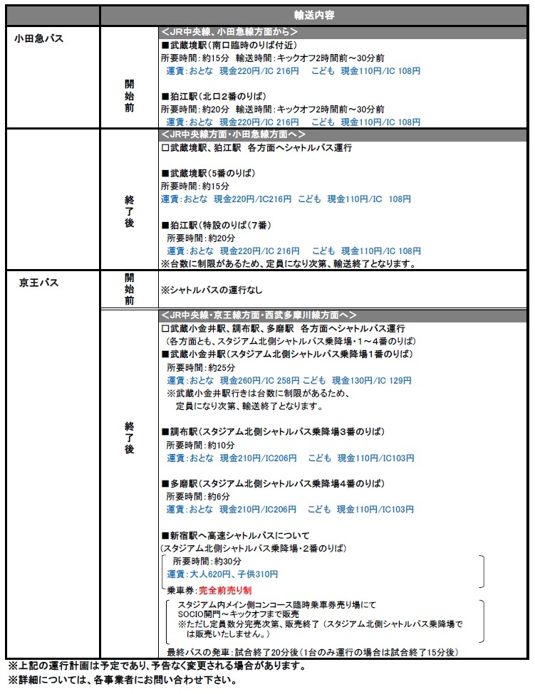 15/6 (Sáb) 2019 Meiji Yasuda Life Insurance Company J1 League 15ª rodada vs Vissel Kobe (início às 19:00 / Ajinomoto Stadium) informações sobre os ônibus shuttle e ônibus de linha que operarão.