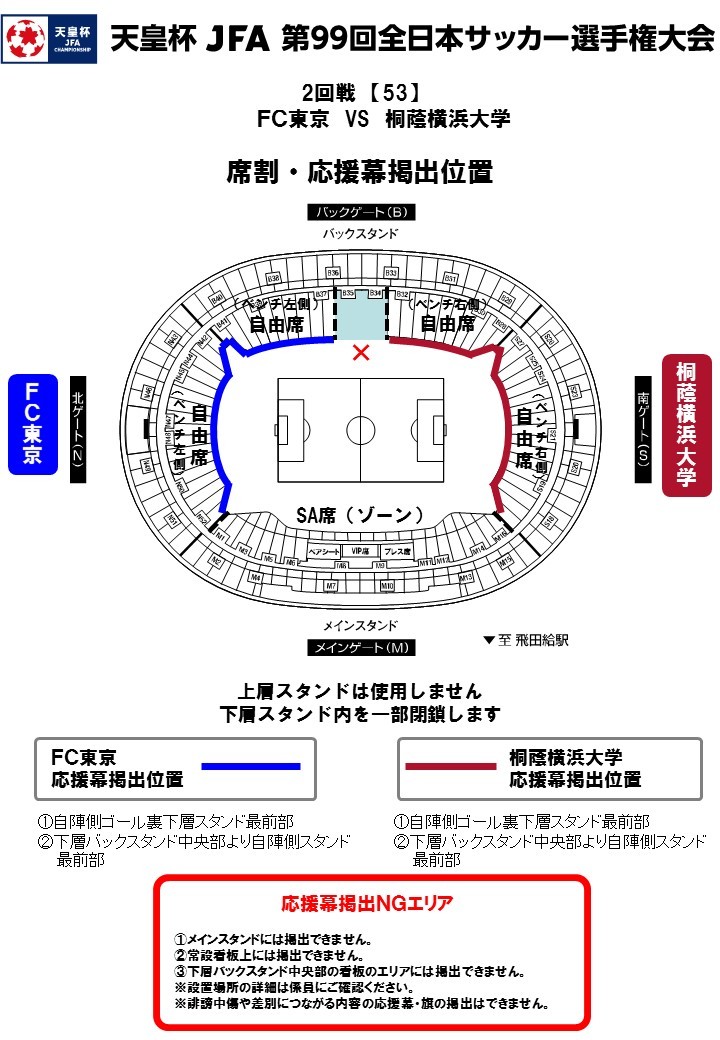 Copa do Imperador JFA 99ª Edição do Campeonato Nacional de Futebol - 2ª rodada FC Tokyo vs Universidade Toin Yokohama. A Associação de Futebol de Tóquio, responsável pela organização da partida, informou sobre o horário de abertura dos portões no dia do jogo, as arquibancadas utilizadas, faixas de apoio, regras para os espectadores, entre outros, conforme abaixo.