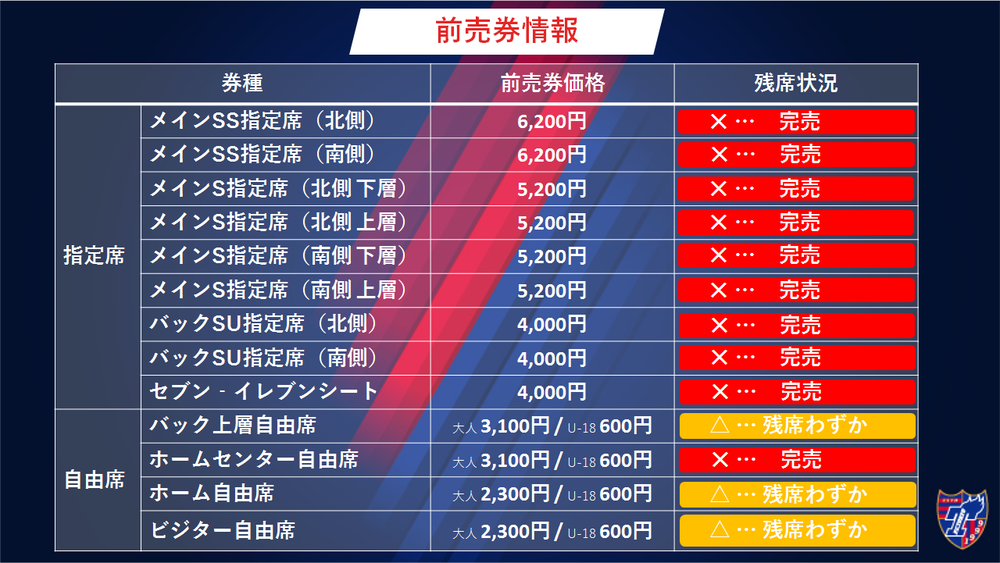 ※Os assentos designados Main SS lado Kitakami norte e sul, assentos designados Main S lado Kitakami norte superior e inferior, sul superior e inferior, assentos designados Back SU lado Kitakami norte e sul, assentos Seven-Eleven, e assentos livres Home Center foram descontinuados. Os assentos livres Home, assentos livres visitante e assentos livres Back superior estão quase esgotados.