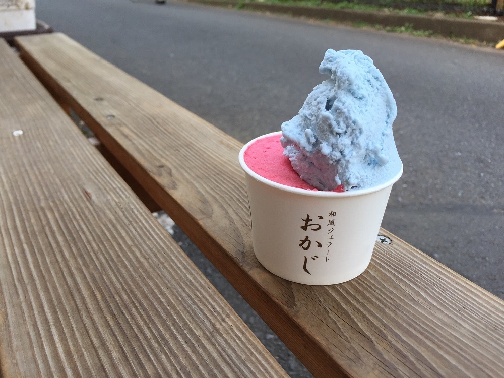 (1) Venda de gelatos originais da "Wafuu Gelato Okaji", incluindo o gelato azul e vermelho inspirado no FC Tokyo