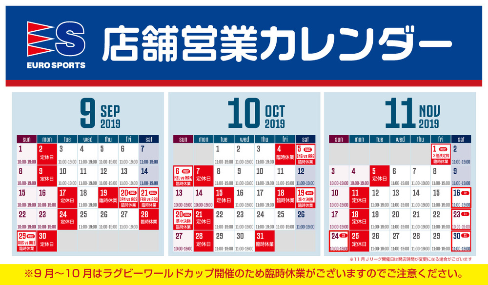 A loja oficial do FC Tokyo, 'Euro Sports Ajinomoto Stadium', estará temporariamente fechada conforme o calendário de funcionamento abaixo devido à realização da Copa do Mundo de Rugby.